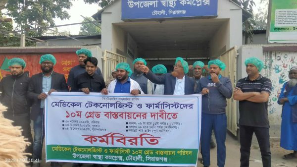 চৌহালীতে দশম গ্রেড বাস্তবায়নের দাবিতে অর্ধ দিবস কর্মবিরতি পালন।