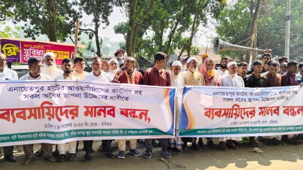 এনায়েতপুরে আওয়ামী লীগ কার্যালয়সহ অবৈধ স্থাপনা উচ্ছেদের দাবিতে মানববন্ধন